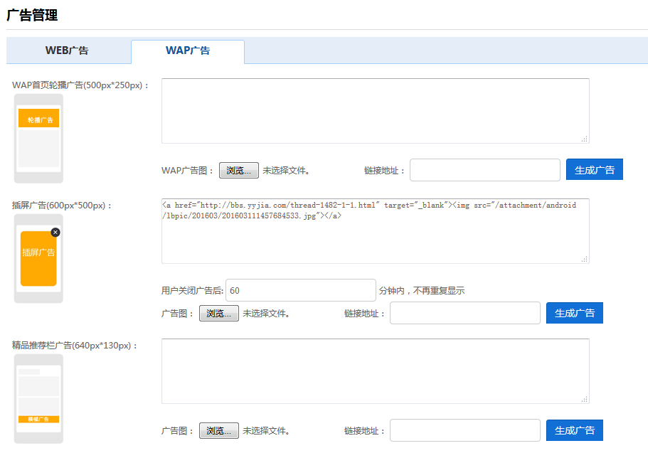 在管理后臺(tái)-站點(diǎn)配置-廣告管理中。新增了一個(gè)廣告圖上傳以及,鏈接地址填寫功能哦, 輕松一點(diǎn)“生成廣告”就完成了廣告設(shè)置,是不是比原來更easy了呢。