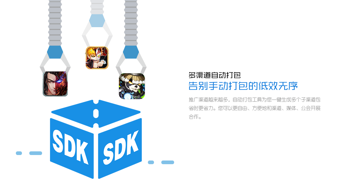 和開發(fā)商(CP)聯(lián)運(yùn),您會(huì)獲得一個(gè)集成了您SDK的游戲母包,越來越多的推廣渠道來協(xié)助您做游戲推廣時(shí),每個(gè)推廣渠道都需要有一個(gè)獨(dú)立的子渠道包,才能統(tǒng)計(jì)每個(gè)渠道的推廣效果,給以不同的推廣分成。而人工將游戲母包集成渠道ID重新打包分成多個(gè)子渠道包是非常繁瑣、還容易出錯(cuò)的。但是,我們的打包工具就能輕而易舉,24小時(shí)無需人工,全自動(dòng)打包,不僅省時(shí)更省力。